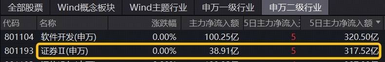 在市场连续突破的同时,各路资金密集涌入券商板块,单日主力资金净流入38.91亿元,为连续5日净流入,区间合计净流入超317亿元,居所有申万二级行业第二位。
