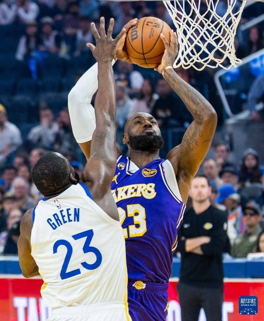 4月9日,勇士队球员格林(左)与湖人队球员德安德烈·艾顿在比赛中争抢。