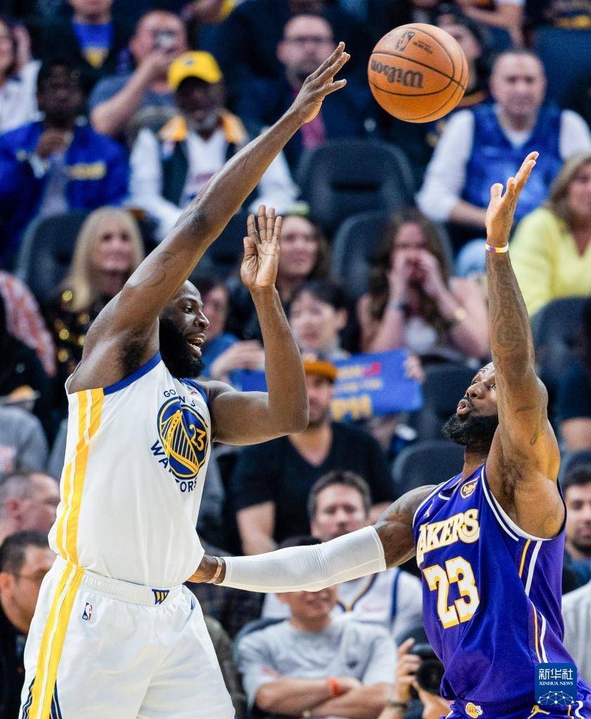 4月9日,勇士队球员格林(左)在湖人队球员勒布朗·詹姆斯的防守下传球。